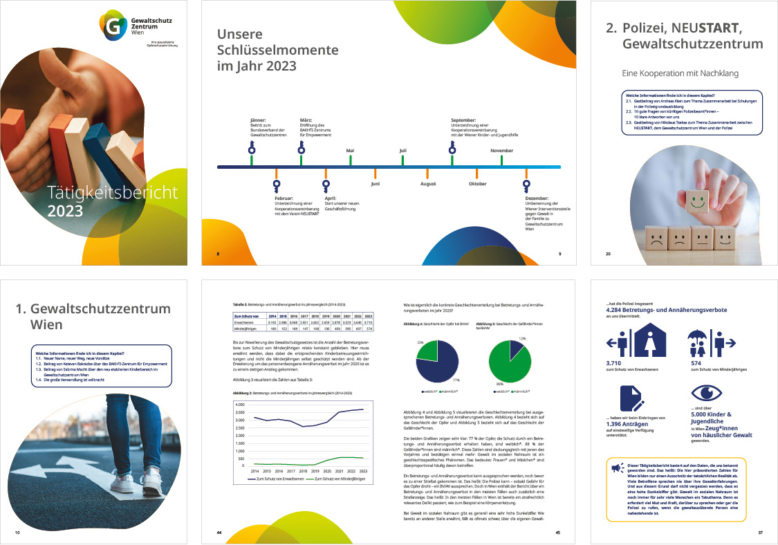Für das Gewaltschutzzentrum Wien gestaltete ich den Tätigkeitsbericht 2023 in einem klaren und übersichtlichen Layout.